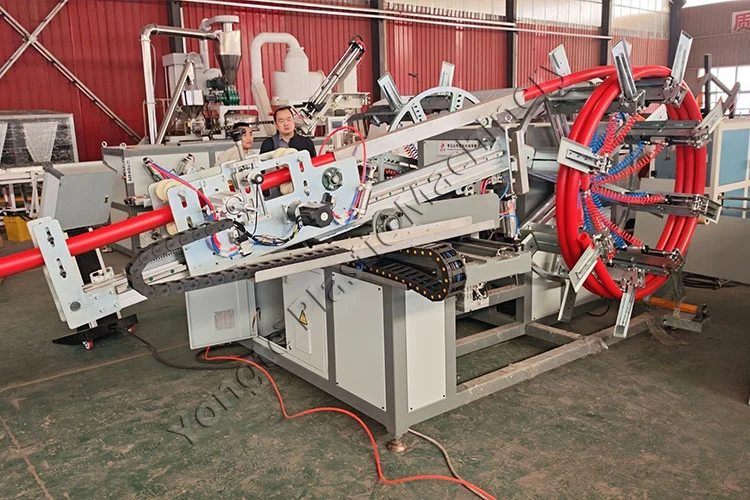 I 2025 leverte vi to skreddersydde sett med automatiske PE-rørviklingsmaskiner til en ledende argentinsk plastforedlingsbedrift. Kunden krevde høyeffektive viklingsløsninger for å matche deres nylig utvidede høyhastighets PE-rørekstruderingslinjer. Ordren omfattet to spesialiserte enheter: en dobbeltstasjons automatisk viklingsmaskin optimalisert for rør med diameter 15-32 mm, og en annen modell med høy kapasitet designet for 20-63 mm diameter. Disse maskinene integreres sømløst med høyhastighets PE-rørekstruderingslinjer for å automatisk vikle rørene til jevne ruller. Utstyrt med et automatisk lengdetellesystem, utløser maskinen automatisk kutting og stasjonsoverføring når mållengden er nådd. Den sikrer samtidig den ferdige rullen og aktiverer en alarm for pakking, og gir en helautomatisk viklingsløsning. Streng fabrikktesting før forsendelse sikret stabil drift på stedet etter levering.