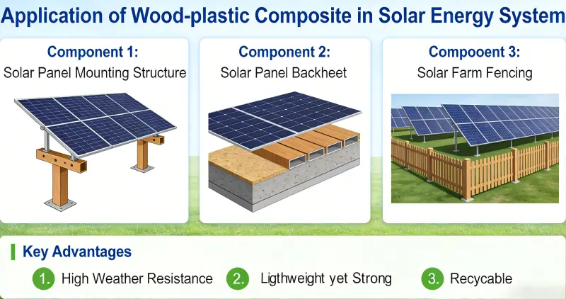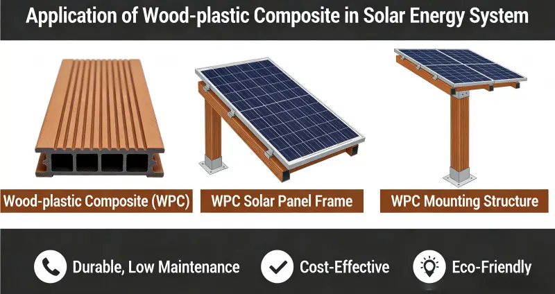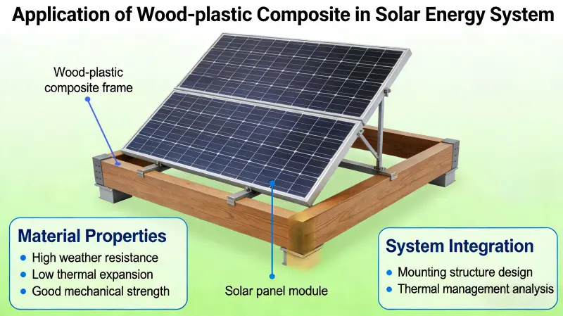Tre-plastkompositt (WPC) har dukket opp som et nøkkelmateriale i solenergisystemer, inkludert fotovoltaiske (PV) monteringer, flytende kraftstasjoner, PV-bygningsintegrasjon og konsentrert solenergi (CSP) lagring, på grunn av dets miljøvennlige, værbestandige, lette, lite vedlikehold og enkle å behandle egenskaper. Den erstatter gradvis tradisjonelle metall- og trematerialer.